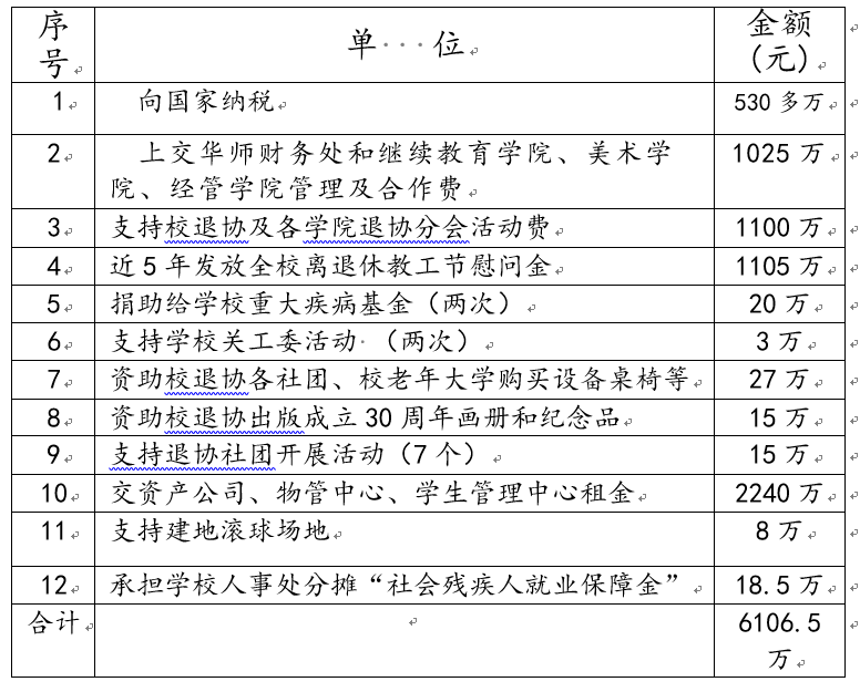 在经济效益方面。据不完全统计,仅仅2013年以来,除了办学成本和办学基金积累之外,上交学校财务处及相关合作院系,国家税收,上交校资产公司、物业管理公司、学生宿舍管理中心,划拨给学校退协工作活动经费、各退协分会活动经费、退协分会会员(约2,113人)节日慰问金、捐助学校重大疾病基金、支持老年大学办学、支持学校“关工委”活动经费、地震灾区捐款等各项经费逾6,100多万元。